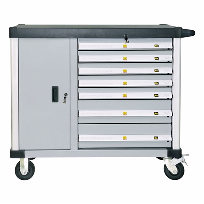 | 采用重型叠加式滚珠滑轨延长使用寿命,加长了伸展距离,使抽屉能100%拉开。每个抽屉都装有独立的防倾斜自锁系统,两侧的网孔板扩展了工具车的使用功能,双向刹车二次解锁脚轮。 |