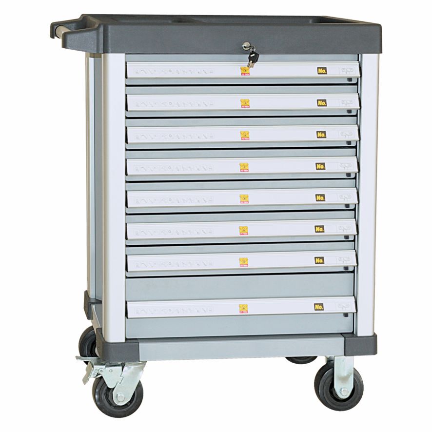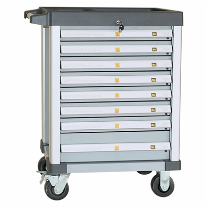 | 用重型叠加式滚珠滑轨延长使用寿命,加长了伸展距离,使抽屉能100%拉开。每个抽屉都装有独立的防倾斜自锁系统,两侧的网孔板扩展了工具车的使用功能,双向刹车二次解锁脚轮。 |